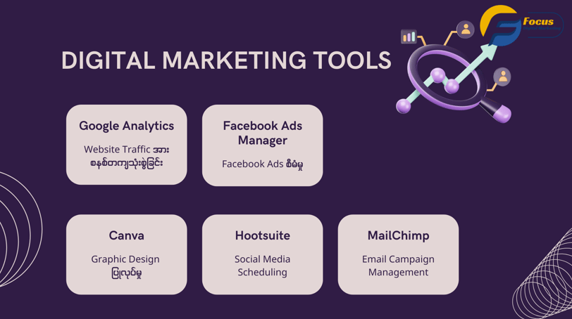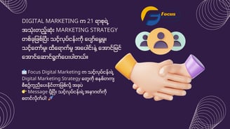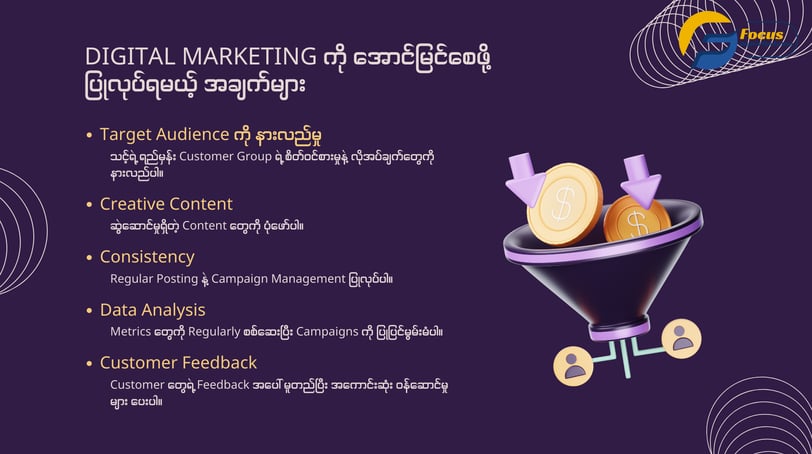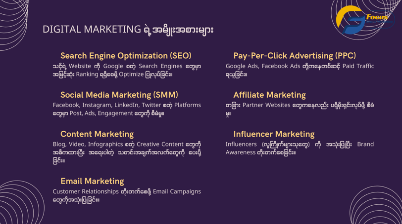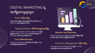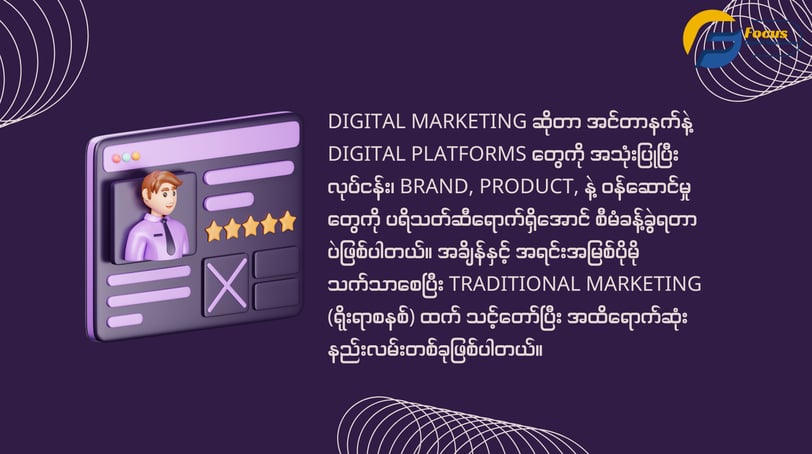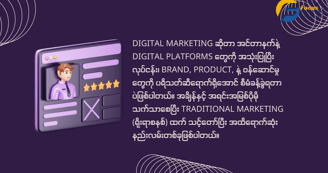 Digital Marketing ဆိုတာ အင်တာနက်နဲ့ Digital Platforms တွေကို အသုံးပြုပြီး လုပ်ငန်း၊ Brand, Product, နဲ့ ဝန်ဆောင်မှုတွေကို ပရိသတ်ဆီရောက်ရှိအောင် စီမံခန့်ခွဲရတာပဲဖြစ်ပါတယ်။ အချိန်နှင့် အရင်းအမြစ်ပိုမိုသက်သာစေပြီး Traditional Marketing (ရိုးရာစနစ်) ထက် သင့်တော်ပြီး အထိရောက်ဆုံးနည်းလမ်းတစ်ခုဖြစ်ပါတယ်။